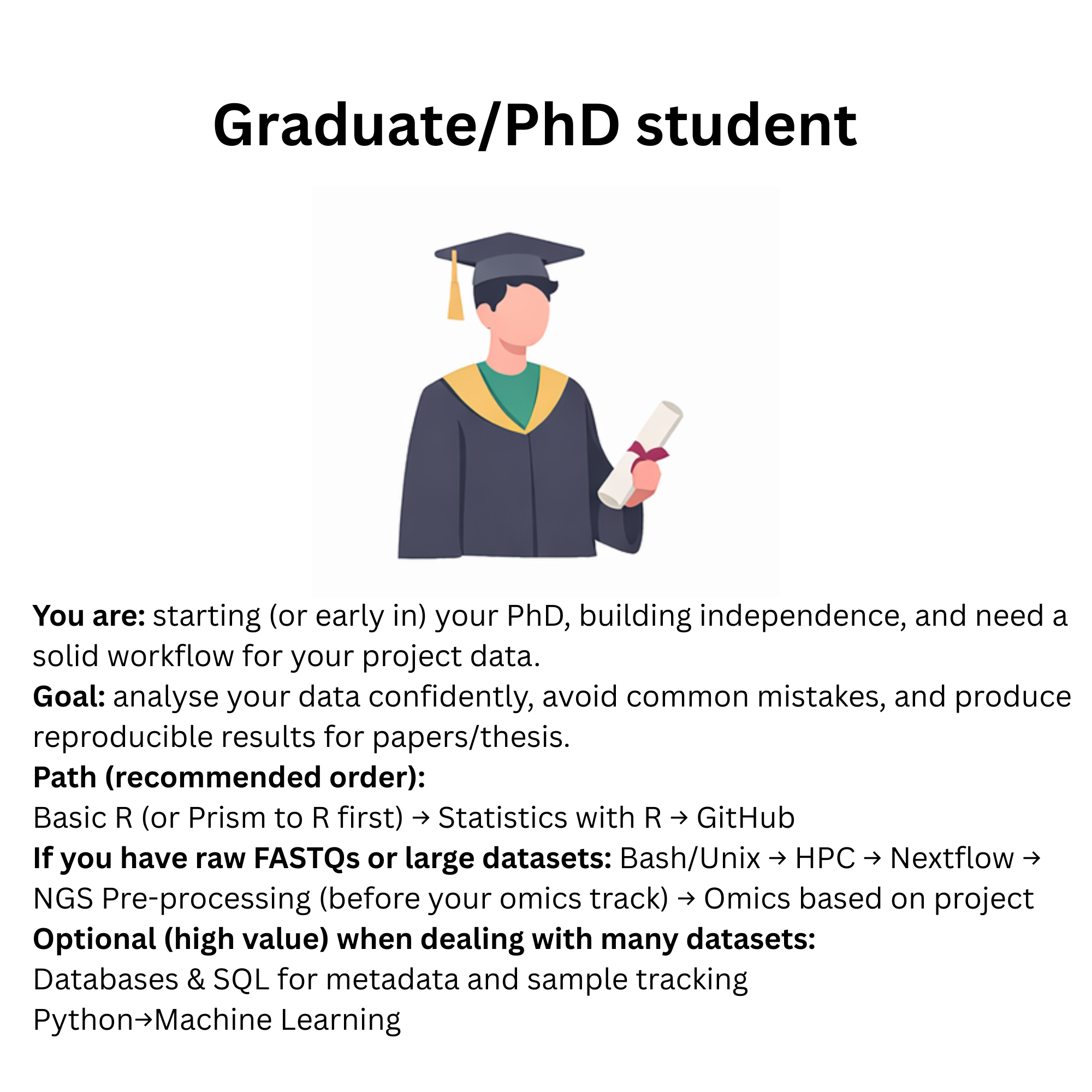 Use the map below to build your pathway. If you are new to data analysis, start with Prism to R and Basic R (and/or Basic Python), then add Statistics with R. Build good habits with Spreadsheets (best practice), Databases & SQL, and GitHub (version control). To work with bigger datasets and pipelines, learn Bash/Unix, then HPC, then Nextflow (Intro → Advanced) and NGS pre-processing. From there you can specialise in Bulk RNA-seq, Single-cell RNA-seq, ATAC-seq, Microbiome, Spatial transcriptomics, and Multiomics, and you can also join the Machine Learning series (Beginner → Advanced).